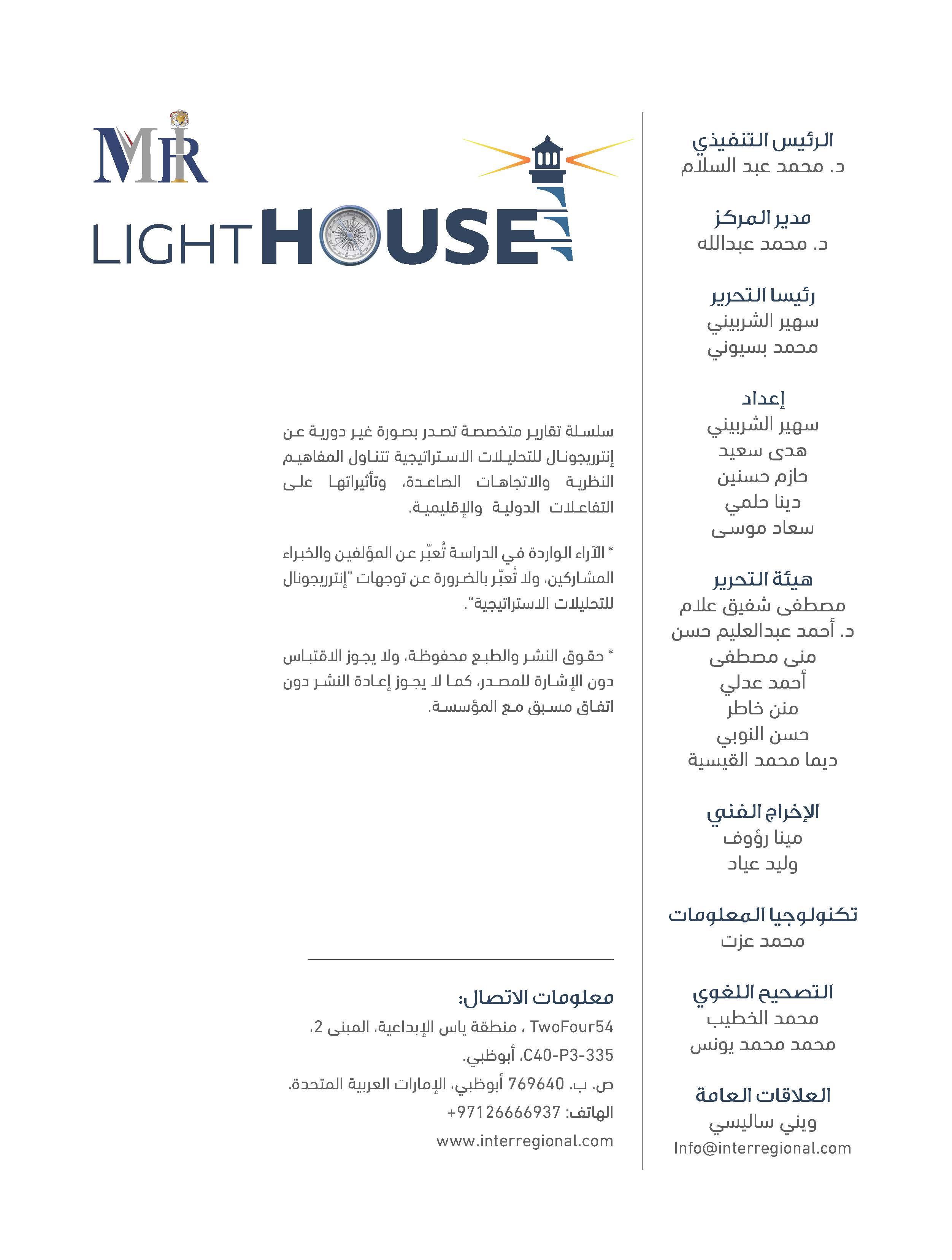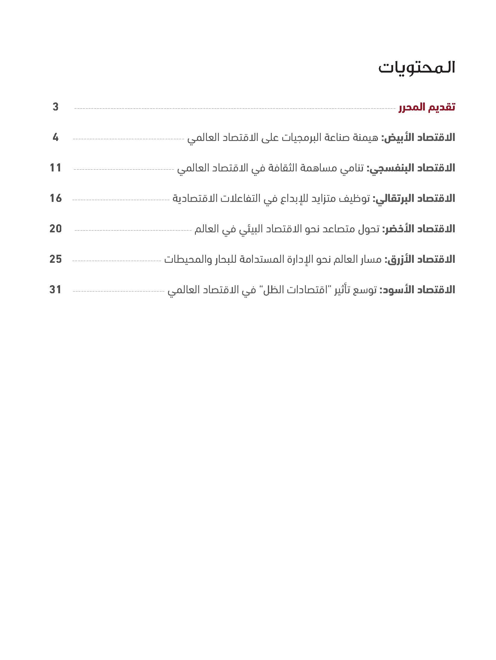 يتعرض العدد الثاني من LIGHT HOUSE – وهي سلسلة تقارير تتناول المفاهيم النظرية والاتجاهات الصاعدة، وتأثيراتها على التفاعلات الدولية والإقليمية – الذي جاء تحت عنوان "Colour Economics: ملامح صعود الاقتصادات الملونة في العلاقات الدولية"، لأبعاد صعود مفهوم الاقتصادات الملونة عالمياً في ظل مساعي الحكومات والمؤسسات الدولية للوصول إلى مستقبل أكثر استدامةً، وتحقيق التنمية المستدامة التي تُعرِّفها الأمم المتحدة بأنها "التنمية التي تلبي احتياجات الجيل الحالي، دون المساس بقدرة الأجيال المستقبلية على تلبية احتياجاتها، والتي تركز على التوازن بين الأبعاد الاقتصادية والاجتماعية والبيئية للتنمية". ومن هذا المنطلق يتطرق العدد إلى ألوان الاقتصاد المختلفة، بما في ذلك مفاهيم الاقتصاد الأبيض والبنفسجي والبرتقالي والأزرق والأخضر، والبحث في تطبيقاتها، ودورها في تنمية اقتصادات الدول، وكذلك مفهوم الاقتصاد الأسود وكيف يُعِيق أهداف التنمية المستدامة.