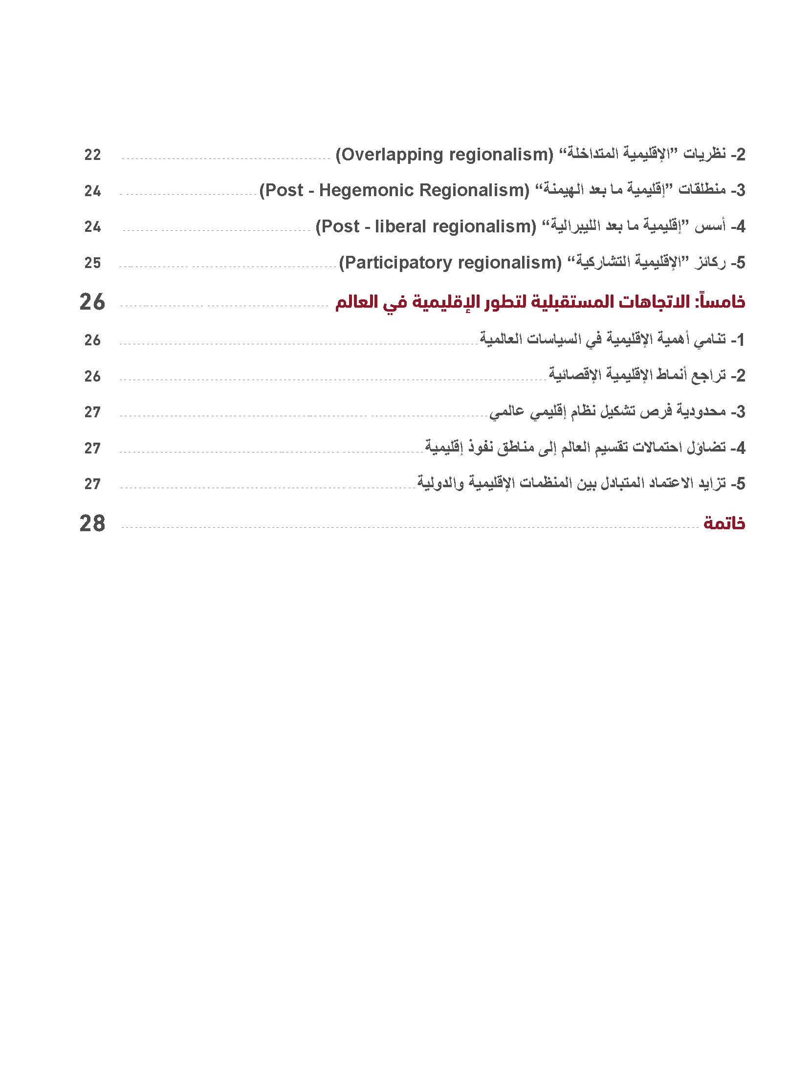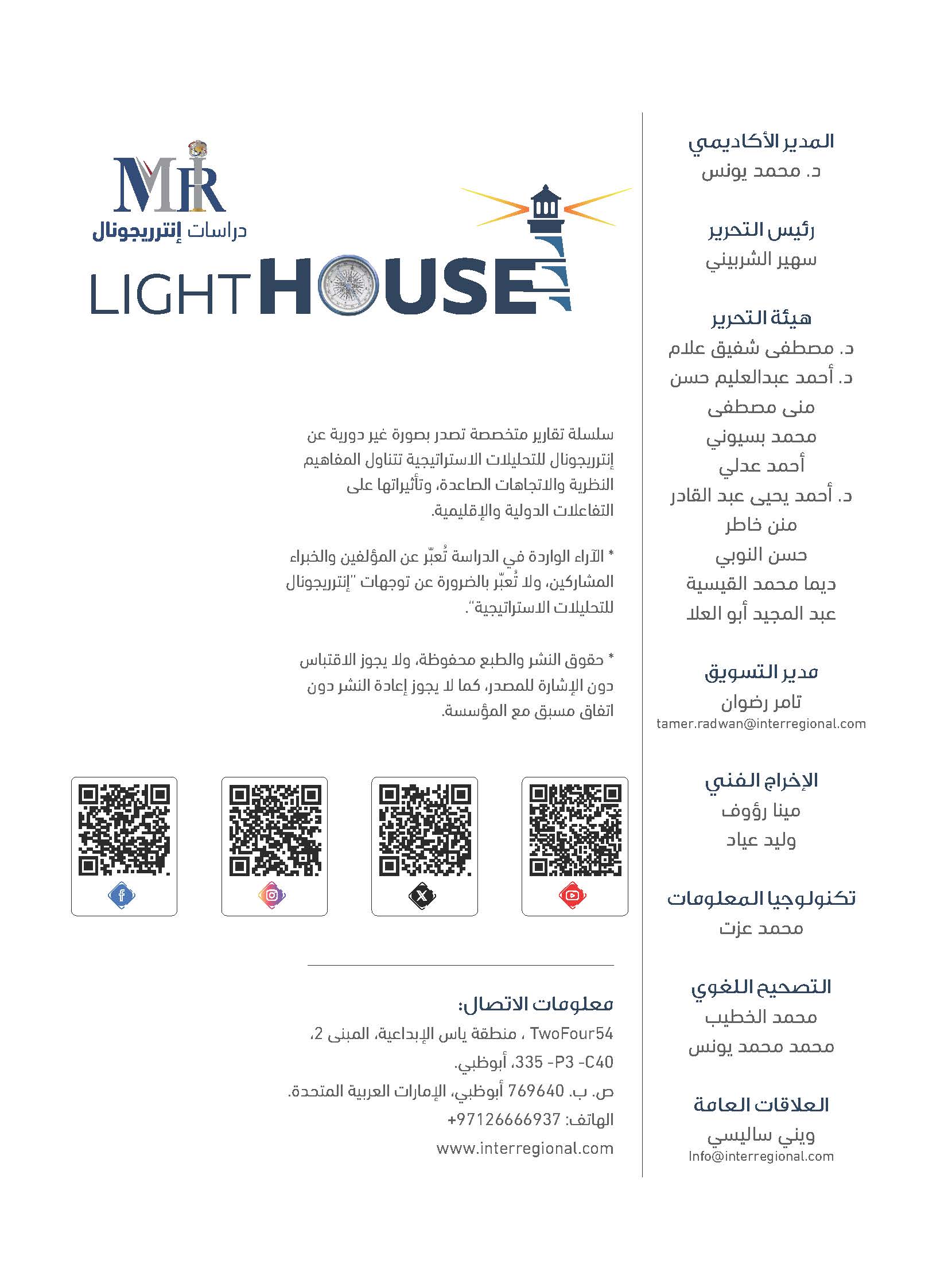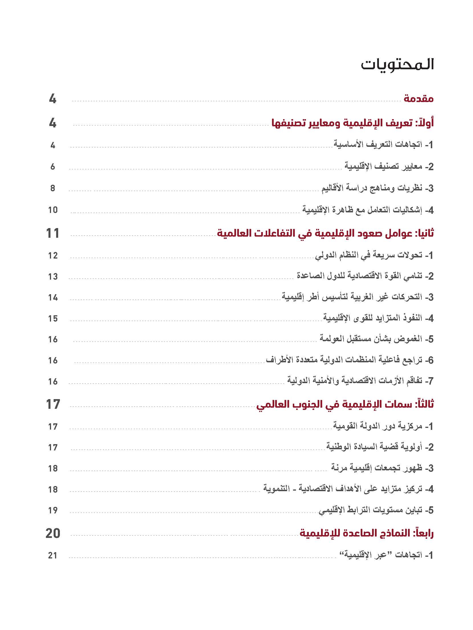 يتعرض العدد الثالث من LIGHT HOUSE – وهي سلسلة تقارير تتناول المفاهيم النظرية والاتجاهات الصاعدة، وتأثيراتها على التفاعلات الدولية والإقليمية – الذي جاء تحت عنوان "Rising Regionalism: صعود الإقليمية في نظام دولي متغير"، لمفهوم الإقليمية ومعايير تصنيفها، ونظريات ومناهج دراسة الظاهرة وإشكاليات التعامل معها، فضلاً عن عوامل صعود الإقليمية في التفاعلات العالمية، وذلك على خلفية صعود النزعة الإقليمية خلال حقبة ما بعد الحرب الباردة، والتحولات الجارية في النظام الدولي، والتغيرات المتلاحقة في مراكز القوة العالمية ، هذا وقد تطرق العدد إلى سمات الإقليمية في الجنوب العالمي والنماذج الصاعدة للإقليمية، وأخيرًا الاتجاهات المستقبلية لتطور الإقليمية في العالم، في ظل تنامي أهمية الإقليمية في السياسات العالمية، ومحدودية فرص تشكيل نظام إقليمي عالمي وتنامي فرص الاعتماد المتبادل بين المنظمات الدولية والإقليمية.