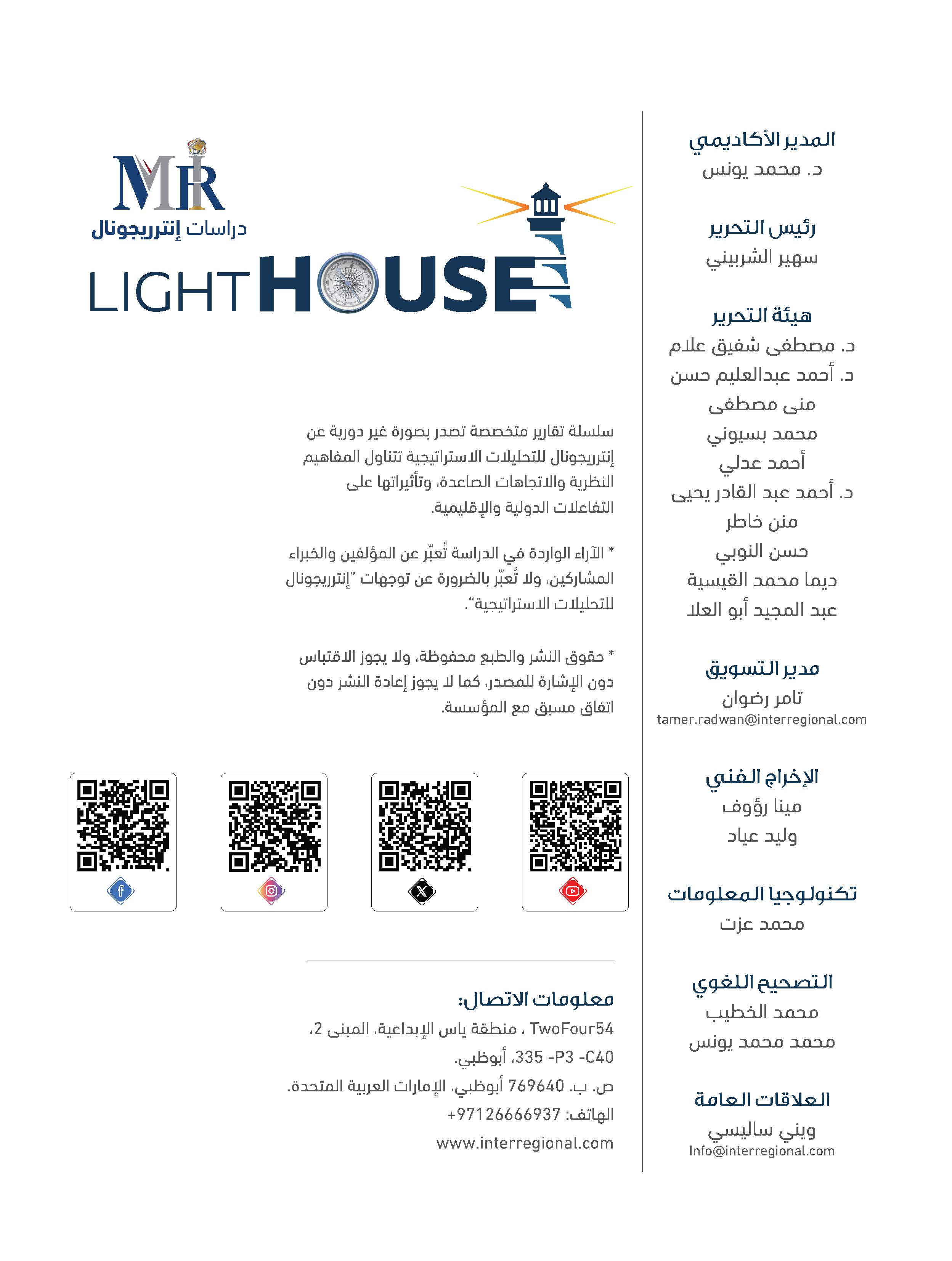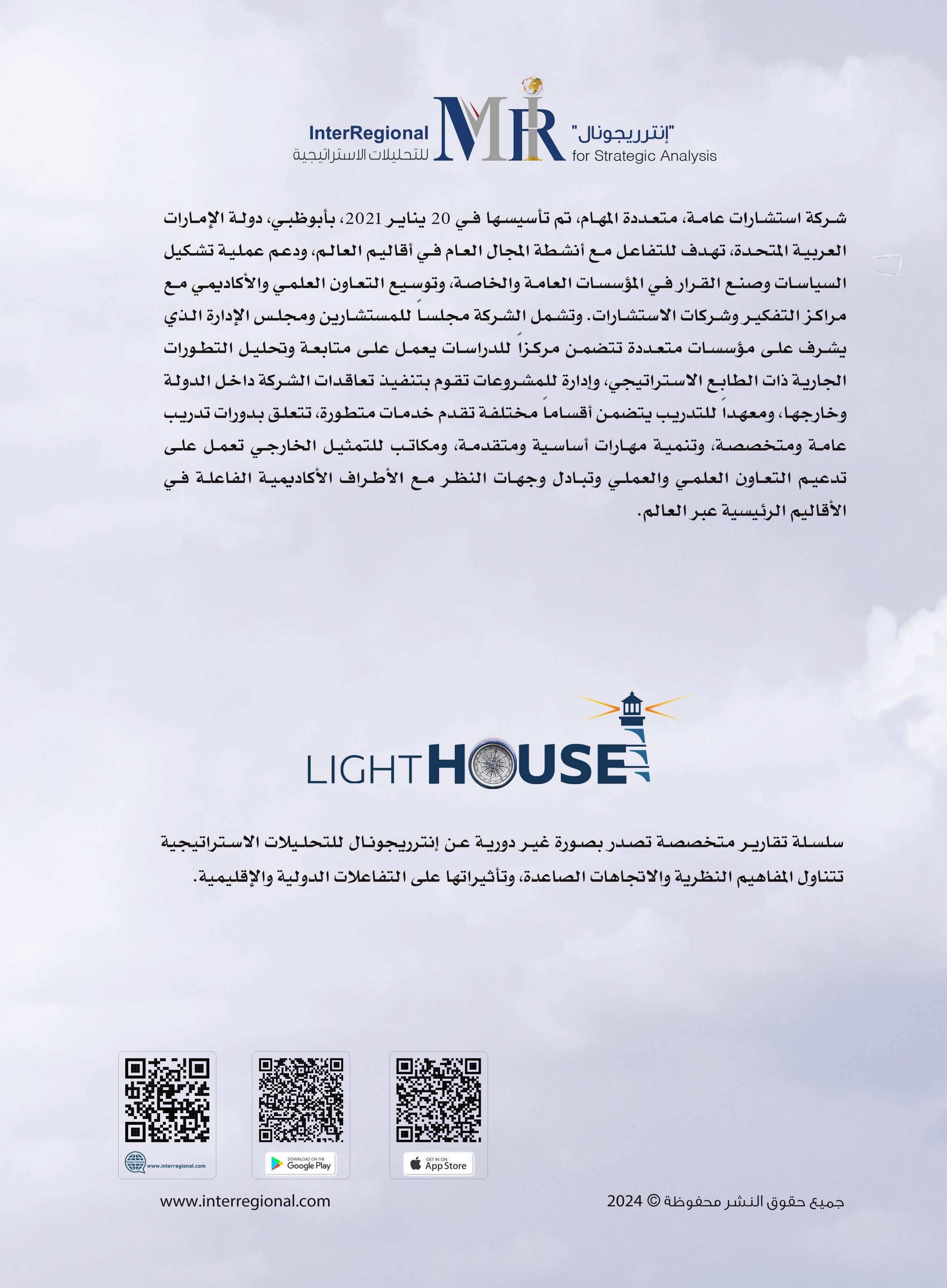 يتعرض العدد الرابع من LIGHT HOUSE – وهي سلسلة تقارير تتناول المفاهيم النظرية والاتجاهات الصاعدة، وتأثيراتها على التفاعلات الدولية والإقليمية – الذي جاء تحت عنوان "Buffer Zones: أدوار المناطق العازلة في التفاعلات الدولية"، لأبعاد مفهوم المناطق العازلة، الذي وبالرغم من تراجع الأهمية الاستراتيجية له مع انتهاء الحرب الباردة؛ إلا أن الحرب الروسية–الأوكرانية، فضلاً عن الصراعات المستعصية في الشرق الأوسط، أعادت إلى الصدارة مفهوم المناطق العازلة والدول العازلة ودورها في العلاقات الدولية ولا سيما في السياقات الصراعية، ومن هذا المنطلق يقدم العدد شرحًا للأنماط المختلفة للمناطق العازلة في ضوء تصنيفاتها على أساس التفاعلات، مع توضيح وظائف المناطق العازلة والتي تتراوح بين دورها كأداة في السياسة الخارجية وأداة لشن الهجمات، والتخفيف من حدة الصراعات في سياقات أخرى، وتوفير ملاذات آمنة للاجئين، وقد خلُص العدد إلى وجود إشكاليات رئيسية تتعلق بمفهوم المناطق العازلة، ما يتطلب مزيد من الاهتمام الأكاديمي بهذا المفهوم الصاعد.