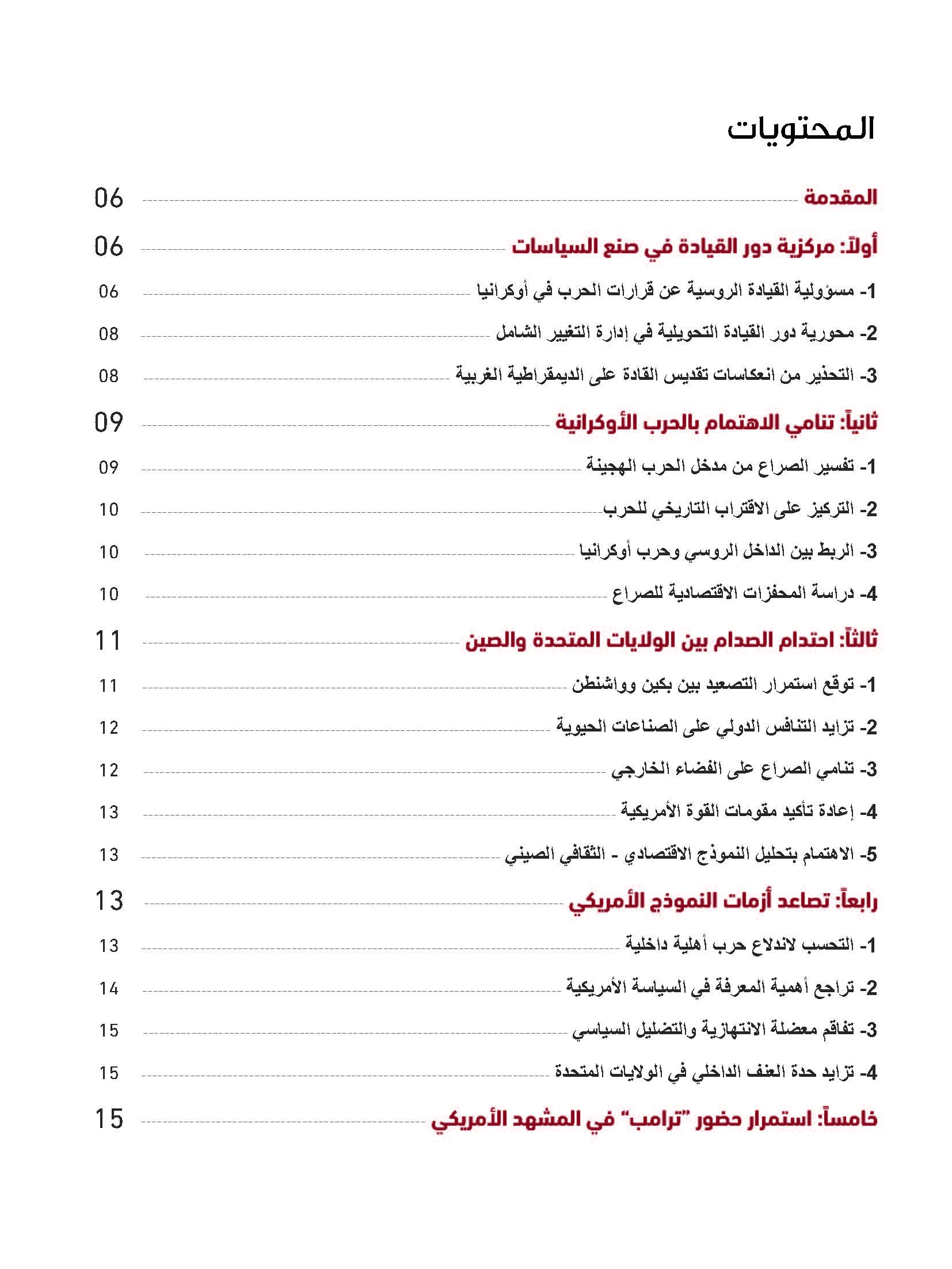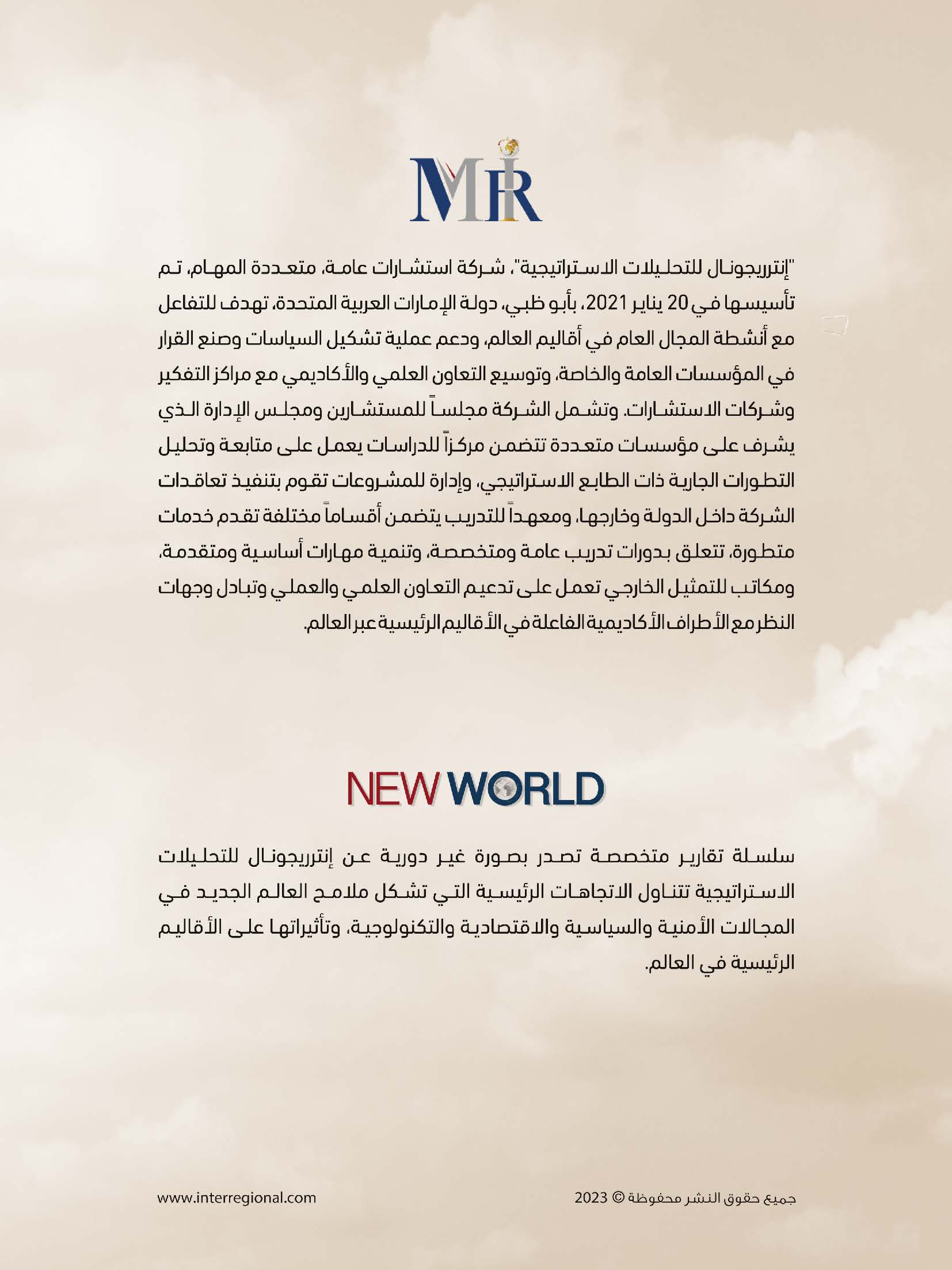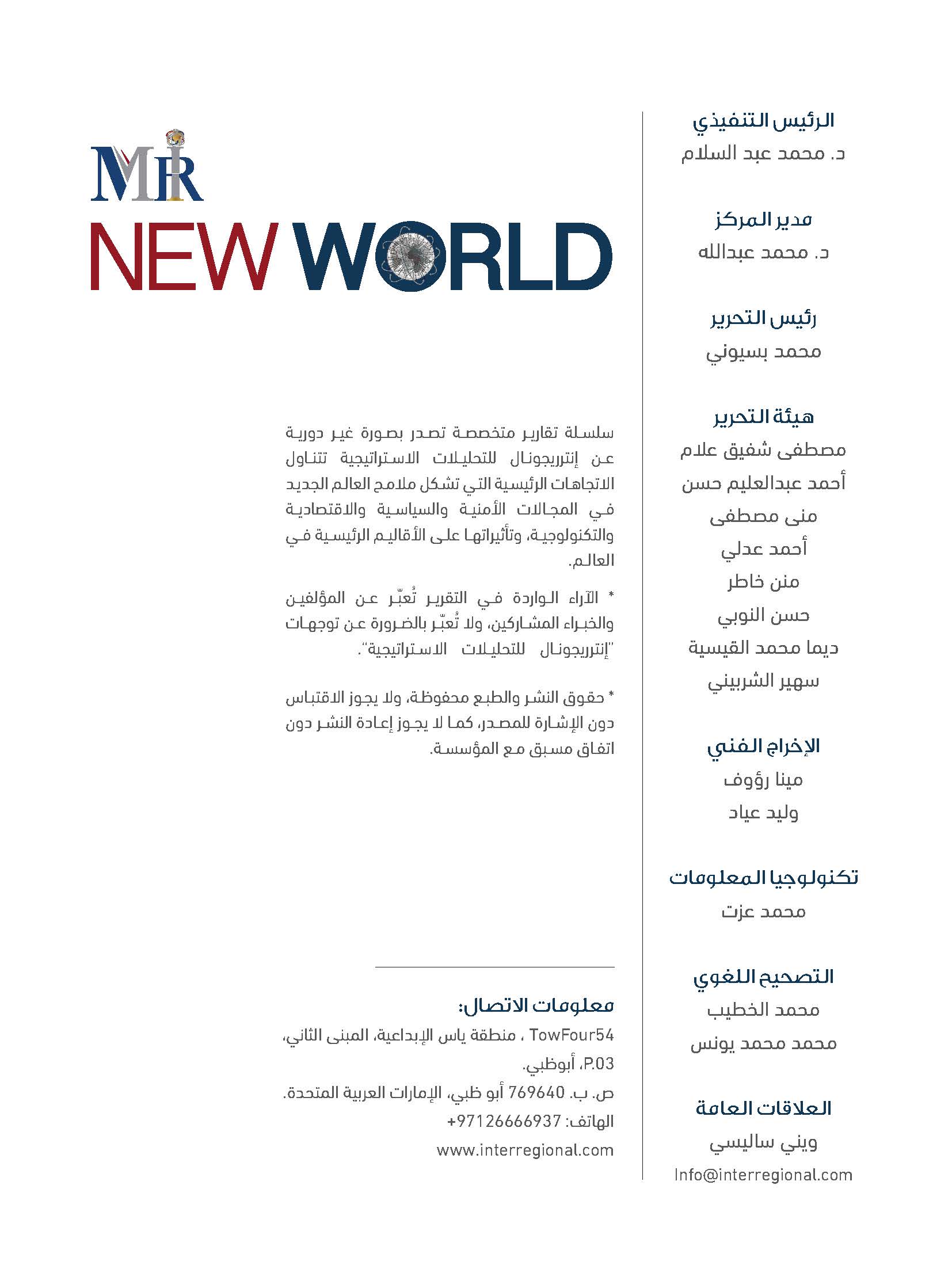 يتعرض العدد الأول من NEW WORLD، الذي جاء تحت عنوان "عالم جديد: كيف تناولت الكتب الأجنبية التحولات المرتقبة في 2023؟"، لأهم القضايا التي تتناولها الكتب الأجنبية خلال العام الجاري؛ حيث تقدم هذه الكتب مداخل رئيسية لتفسير التفاعلات والتحولات الجارية في النظام العالمي. وتكشف المراجعة السريعة للكتب الصادرة خلال 2022، وتلك المرتقب صدورها خلال العام الجاري، عن الاهتمام بعدد من القضايا؛ في مقدمتها الصراع الأوكراني الذي يبدو أنه سيقود نحو تغيرات راديكالية في النظام الدولي القائم. وتظل قضية القيادة مدخلاً تفسيرياً هاماً لما يحدث، ولطبيعة التفاعلات بين الدول. هذا المتغير القيادي يتم استدعاؤه أيضاً عند الحديث عن قيادة النظام الدولي وحالة التنافس المحتدم بين الصين والولايات المتحدة في هذا المضمار. وبقدر ما تحظى التهديدات التقليدية باهتمام واضح من قبل الأدبيات، فإن التهديدات غير التقليدية هي الأخرى تسترعي انتباه الكتب، وخصوصاً مع تزايد مخاطر الكوارث الطبيعية والأوبئة. وتشغل قضية التكنولوجيا أيضاً حيزاً مهماً في الكتب الصادرة. وبالرغم من تأكيد هذه الكتب أهمية التكنولوجيا في دعم القدرات البشرية والتعامل مع اللايقين؛ فإنها أوضحت أيضاً أن الاعتماد عليها يُواجِه عددًا من التحديات الأخلاقية والمجتمعية والأمنية.